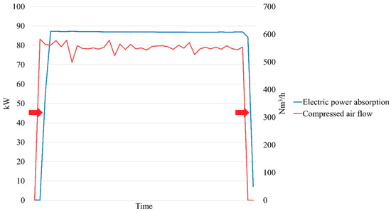 Electric power absorption and compressed air flow rate over time. The graph shows a 15 minutes delay between electric power absorption and compressed air production (data at a 15 minute frequency).