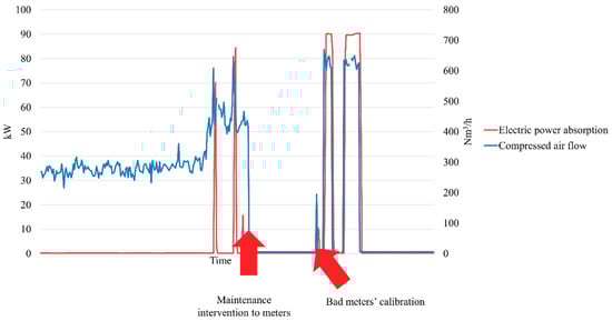 An accurate data synchronization and validation (Step 6) was performed in order to correctly aggregate data to the chosen frequency (from 15 min to one day), the level of detail (summing up data related to different compressors) and to avoid meters’ inaccuracies in affecting the data analysis. First of all, some flaws were identified and corrected by observing and comparing measured data: a 15 minute delay was observed between electricity consumption and compressed air production (as shown in Figure 5) and bad compressed air flow meters’ calibration (meters measuring compressed air flow while compressors were off, as shown in Figure 6).