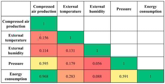 The first data analysis (Step 7) was conducted through correlation and regression, considering the system’s energy consumption and the identified energy drivers in the data collection period. As a result, the only parameter showing a satisfying correlation with the energy consumption of the compressors and no multicollinearity with the other parameters, was the amount of compressed air produced, as reported in Table 2. The results of the multicollinearity analysis are represented in the form of a correlation matrix with a color scale in Figure 7.