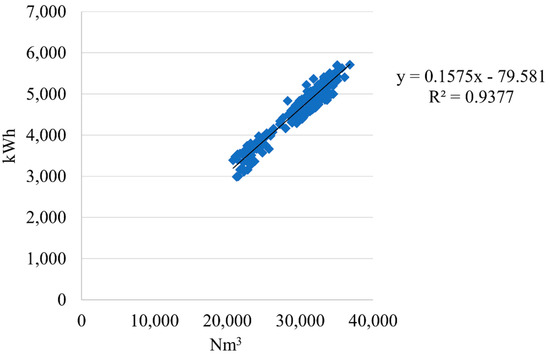 The first statistical tool is the correlation analysis of the previously collected energy drivers and energy consumption data to define the dependence of the energy behavior of the system on identified energy drivers, thus allowing preliminary qualitative considerations. Moreover, in order to get more quantitative information, it is possible to perform regression analyses, using the coefficient of determination (i.e., R2) and the related probability (i.e., P_value) [81,83] to analyze the strength of the correlation and select the energy drivers on the basis of their actual influence.