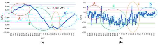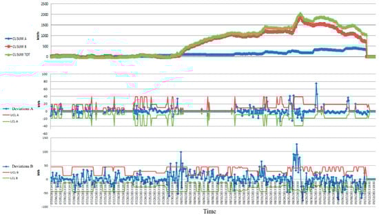 Moreover, a second control chart, the cumulative sums chart, or CuSum, is used to deepen the analysis of the energy behavior of the system. Every point in the CuSum chart shows the value over time of the cumulative sum of energy performance deviations, defined as and is calculated as follows: