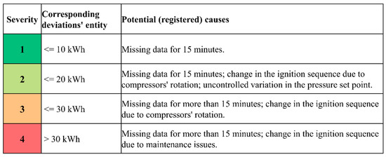 In addition, it is possible to set up a registry (similar to fault registries already in use in industry for maintenance management purposes [84]) where all anomalies identified in the charts are collected together with relevant information such as time and entity of the deviation, values of all energy drivers, operating conditions, and causes of the anomaly. This kind of registry enables the analysis and classification of anomalies and allows identifying recurrences, patterns and similarities in the control charts, in order to promote the association of the most likely causes for each new anomaly in a quick and automatic way on the basis of past events (e.g., progressive obstruction of air compressors’ filters resulted in a typical slope of the CuSum chart).