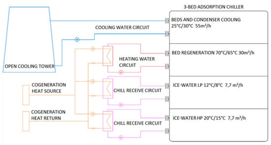 The prototype chiller is comprehensively presented in [4]. The chiller was manufactured by New Energy Transfer S.A. (Warsaw, Poland), located in Wrocław Technology Park. Its nominal cooling capacity is 2 × 45 kW. The 3-bed adsorption chiller is driven by hot water from the cogeneration source through the heat exchanger. Cooling water is supplied by the open cooling tower. The chiller’s receiver circuits are supplied by the heat exchangers connected to the cogeneration source. This configuration allows water temperature to be regulated in all circuits. The scheme of the test stand is shown in Figure 1, while Figure 2 presents the views of the chiller and the accompanying installations.