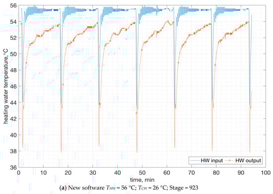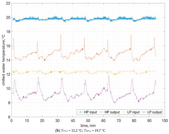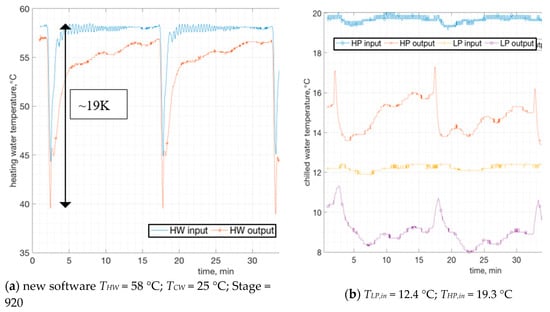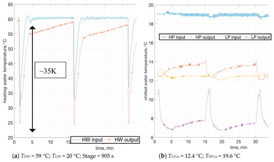 Due to the application of the new control system, fluctuations of hot water have decreased, as seen in Figure 9a. The heating water temperature amplitude was lowered significantly from 32–40 K (Figure 8a) to 18–23 K (Figure 9a), improving the efficiency of the operation of the chiller and the stability of the heat source. Moreover, the increase in temperature of the chilled water was also mitigated due to a decrease in the pre-cooling time. Additionally, due to the application of mass regeneration, a short increase of pressure in the HP evaporator at the end of each stage can be observed (see Figure 9b). This process lasts only about 10 s and has a small effect on the HP chilled water temperature, but it positively affects the efficiency and improves pre-cooling. Also, the hydraulic impact has been removed.