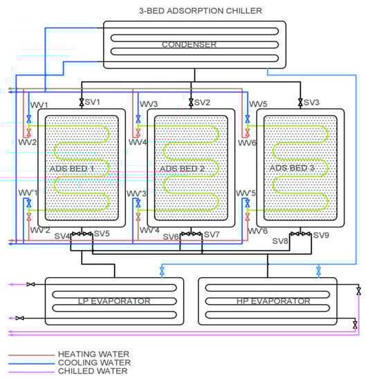 - Wang, X.; He, Z.; Tong, H. Performance simulation of multi-bed silica gel-water adsorption chillers. Int. J. Refrig. 2014, 2, 32–41. [Google Scholar] [CrossRef]
