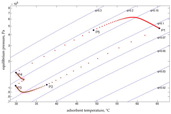 Bed working cycle shown as equilibrium pressure and adsorbent temperature dependency. One point symbolizes 5 s of the bed working. Adsorption isosters are presented too. A degree of adsorption of silica gel [kg adsorbed water/kg dry silica gel] is marked with a “q” symbol. Bed working cycle: Pre-cooling, P1 -> P2; low pressure adsorption, P2 -> P3; high pressure adsorption, P3 -> P4; pre-heating, P4 -> P5; desorption, P5 -> P1.