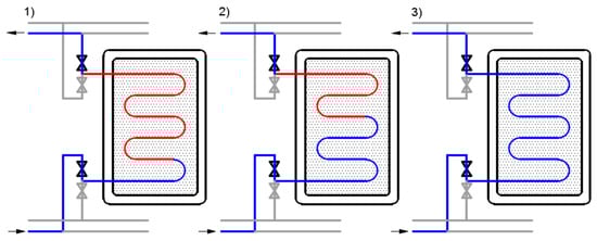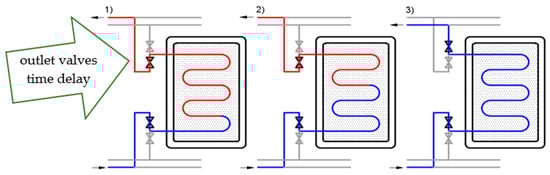 The new control system executes the delay between the switching of the water valve at the outlet until the temperatures of the water leaving the beds during pre-cooling and preheating are similar; this is illustrated in Figure 7. The optimal delay time for switching between valves was experimentally determined to be 35–50 s and depended on the flow rate and initial temperature of the water. This enables the water remaining in the bed to be save and also regenerates some heat from the bed. The analogous process takes place in the bed that has been switched from cooling to heating mode.
