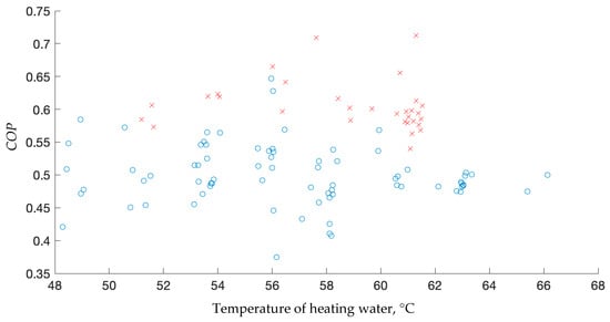 COP with respect to the temperature of the heating water, with cooling water temperature at 25℃ and a switching time of 800–1000 s. Blue circles—original control system, red crosses—new control system.