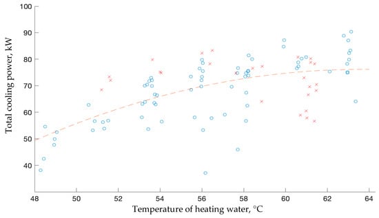 The total cooling power of the chiller with respect to the temperature of the heating water with cooling water temperature 25 °C and a switching time of 800–1000 s. Blue circles—original control system, red crosses—new control system.