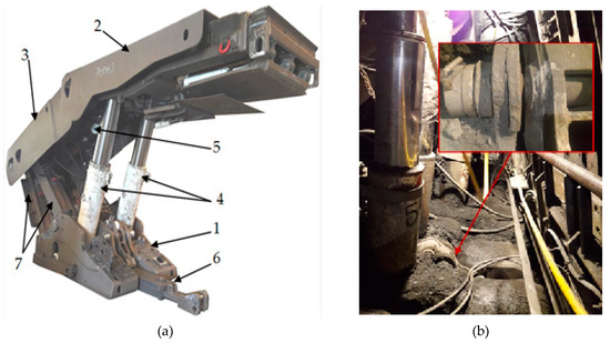 Figure 1a presents the powered roof support section type Glinik-20/45-POz, with basic hydraulic components marked. The design of the powered roof support section is complex. The basic structural elements of this section are (Figure 1a): Floor base (1), canopy (2) in direct contact with the roof and shield support (3), hydraulic support system with two hydraulic legs (4), canopy support (5), roller system (6) and lemniscate mechanism (7). Figure 1b shows the effects of the operation of the support with uneven loading resulting from failure to keep its geometry. There was a visible crack in the lug mounting of the roller system’s bolt of the powered roof support.