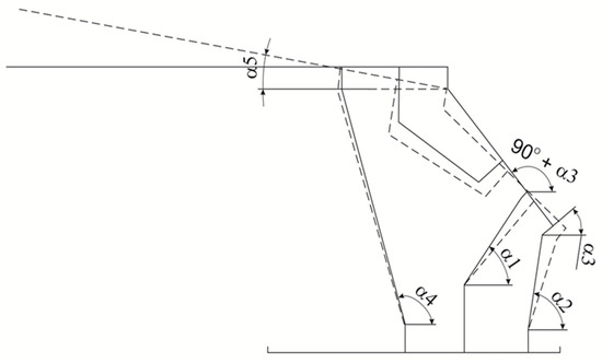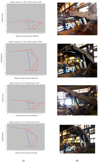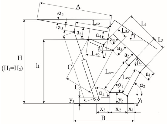 In the analyzed case, it was assumed that the following geometrical parameters would be significant from the point of view of the stability of the section: The angle of inclination of the shield support and the angle of inclination of the links of the lemniscate mechanism corresponding to the respective angles of the height of the ideally spragged section. The ideal condition corresponds to the height at which the joints of the inclined canopy and the shield support are maintained. This height depends on the canopy inclination angle (Figure 3) and is defined by the following dependent [37,41,43,44]: