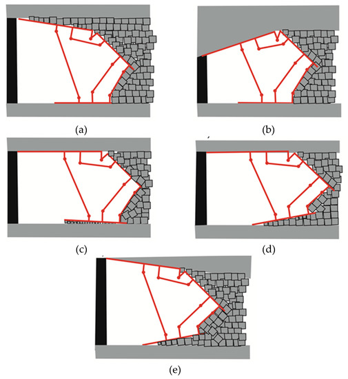 Examples of real spragging of powered roof support sections under a bent roof (a), with a shaded seam from the roof (b), with a shaded seam from the floor (c), with a thickening from the floor base (d), with irregular floor and roof (e).