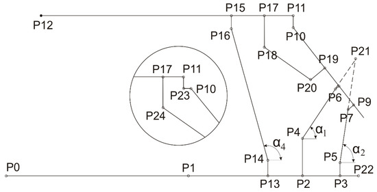 The analysis of geometrical features for the simplified model of a powered roof support presented in Figure 5 was carried out using the specially prepared software. The whole calculation process begins with determining and checking the kinematic chain geometry. Geometric calculations were made for three cases: A horizontal canopy, a canopy at a positive angle of inclination (tilting up) and a canopy at a negative angle of inclination (tilting down). Additionally, the user can choose between the calculation with or without the minimum and maximum length of the canopy support. The results of the calculations carried out are combinations of geometric features presented in the form of data describing the coordinates of individual kinematic nodes of the section (Figure 5).