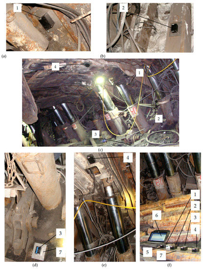 Method of mounting of inclinometer sensors and their location on the structure of the Glinik-20/45-POz section, (a) inclinometer placed in the shield support to the side of the support’s cylinder, (b) inclinometer located in the upper lemniscate, (c) inclinometers located in the construction of the section, (d) inclinometer in the floor base, (e) the view from the face of the longwall of the inclinometer located in the canopy, (f) measuring system. 1: Shield support’s position sensor, 2: Lemniscate tie rod’s position sensor, 3: Floor base’s position sensor, 4: Canopy’s position sensor, 5: Radio, 6: Computer with the application, 7: Mounting plate with magnets.