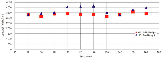 The research team recorded the values of angles determining the location of individual elements of the powered roof support section. The results were used to determine the position changes of these elements depending on the section geometry. The height ranges of individual sections in the tested wall were also determined. In this case, the section height was determined at the beginning of the test (H1) and at the end (H2). The obtained results for the examined sections, after four operational changes, are presented in Figure 10. The obtained results clearly indicate that during the work there were large changes in the height of the examined sections. In fact, only for sections number 70 and 140, no significant changes in this amount occurred during the tests. In other cases, there were significant changes that indicate major changes in the setting of these sections. The results of the section geometry tests are presented in Table 3.