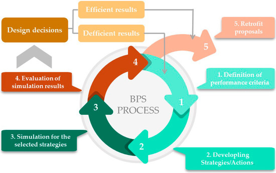 In the building performance simulation (BPS) based process, a virtual model is constructed to determine the best retrofit strategies through predictive performance simulations. The simulation leads to the assessment of results against pre-conceived and determined performance criteria. In case of deficient results, the retrofit strategy/action is altered and the process is repeated as shown in