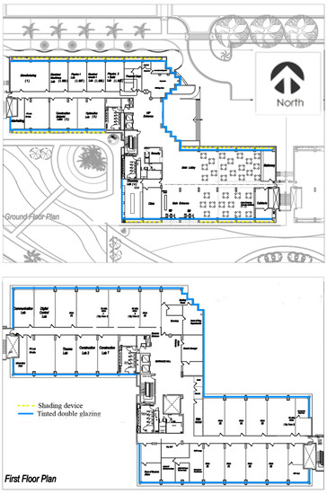 Figure 7. Shading treatments are used in the ground floor in the south, east, and west elevations in