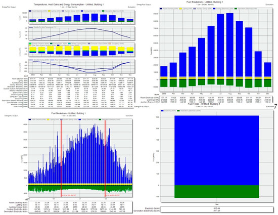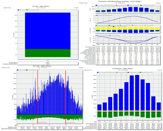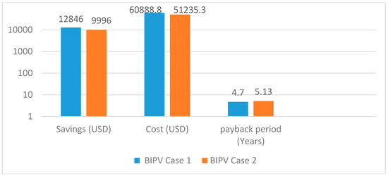 Figure 10 with two types of BIPV (Case 1: BISOL Premium BXO 365 Wp, monocrystalline and Case 2: BISOL Premium BXU 330 Wp, polycrystalline). The partial replacement of the facade represented in the solid parts makes up 508.08 m