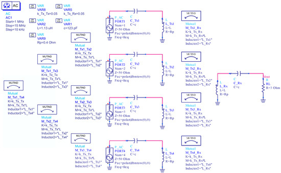 Consider the multiple-input single-output (MISO) WPT system configured as four transmitting coils and a single receiving coil, where all transmitting coils are modeled as an inductance of 1.1 μH and a parasitic resistance of 0.4 ohm. Additionally, we assume that all coupling coefficients among transmitting coils are fixed to 0.05, and coupling coefficients between transmitting and receiving coils are also fixed to 0.05. The assumption that all coupling coefficients among transmitting coils are the same for all transmitting coils is difficult to realize in practice, but this assumption is effective in simulating the PTE of a multi-coil WPT system, because the input signals of all transmitting resonators have the same value when the magnetic beamforming algorithm is applied. Figure 1 shows the schematic diagram of the MISO WPT system for circuit simulation using the Keysight’s ADS (Advanced Design System).
