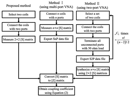 Figure 4 shows the measurement procedures of the proposed method and two conventional methods for coupling coefficients among multiple coils. Method I using a multi-port VNA is very convenient because all relationships among coils are measured at once. However, if the number of coils is larger than the number of ports of the network analyzer, this method cannot be applied. Additionally, the measured high-order [S] matrix is not instantaneously converted to the corresponding [Z] matrix on the common VNA, so the [S] matrix should be saved in an SnP (touchstone) file format and converted on an external PC. Method II using a two-port VNA requires repetitive two-port measurements nC2 times for all possible sets of two coils and all unconnected coils terminated with a 50 ohm load. In addition, the total n × n [S] matrix should be synthesized using 2 × 2 [S] matrices. On the other hand, in the proposed method, only two coils are connected with a two-port VNA, and the coupling coefficient obtained from Equation (2) can be immediately checked on the display of the VNA according to the distance between coils. Additionally, this method is not limited to the number of coils. Therefore, the proposed method has very simple procedures.