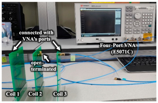 To simplify the problem, consider that there are three coils mutually coupled with each other. Figure 5 shows the experiment setup to verify the performance of the proposed method. Three coils were aligned co-axially. The coupling coefficients between the first and third coils were measured by changing the distance between the two coils in the HF band, in which the second coil was always located in the middle of the two coils. The parameters of the coils are summarized in Table 1. The coil with the inductance of 1.1 μH was designed to have an high quality factor of about 250 at 6.78 MHz, and it has three turns and a single layer printed on the FR-4 substrate, of which the dimension is 95.7 mm × 105.7 mm. The coil of 3.8 μH was fabricated to verify the proposed method for coils with high inductance, and it has six turns and two layers printed on the FR-4 substrate of the same dimension as the coil of 1.1 μH.