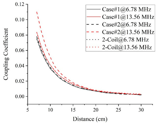 Figure 6 shows the results measured by Method I using Keysight’s four-port VNA, E5071C, for Cases #1, #2, and only two coils without a middle coil. Ideally, the coupling coefficient between two coils must maintain a constant value regardless of the frequency and existence of other coils. However, as the distance between the farthest coils decreases, the measured coupling coefficients deviate from that of the two coils without a middle coil. The deviation increases further as the frequency increases and the inductance of the middle coil increases.
