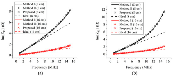 Figure 8 shows the reactance of transfer impedances measured by the conventional and proposed methods with respect to the frequency at the distance of 8 cm and 16 cm between the farthest coils. In spite of the simple measurement procedure, the proposed method provides accurate results that are similar to those of the conventional methods. That is, the proposed method can be used to measure the transfer impedance, as well as the coupling coefficient.