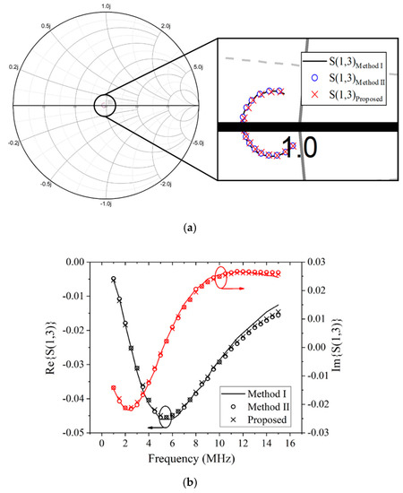 To validate the accuracy of the proposed procedure, the measured Z parameters were converted into the S parameters and they were compared with the results obtained from Methods I and II. First, in order to obtain a 3 × 3 [S] matrix from the proposed measurement method, a set of two coils was connected to a two-port VNA, and a 2 × 2 [Z] matrix was measured with the other coils open-circuited. For the other set of coils, 2 × 2 [Z] matrices were measured, and a 3 × 3 [Z] matrix was constructed by combining three 2 × 2 [Z] matrices. Finally, a 3 × 3 [S] matrix was obtained from a 3 × 3 [Z] matrix by applying conversion equations. Figure 9a,b shows the S13 from Methods I and II, and converted from the proposed method in a range from 1 to 15 MHz on the Smith chart and rectangular plot, respectively. S13 is the transmission coefficient from port 3 to port 1 when all other coils are terminated in matched load of 50 ohms. However, in reality, the coils of a WPT systems are not terminated with 50 ohms, and then S13 has no special physical meaning. Neverthless, the [S] matrix converted from the [Z] matrix obtained by the proposed method is in good agreement with the [S] matrix obtained by the conventional methods in the frequency range from the LF to HF band. This means that the proposed method provides accurate measurement results.