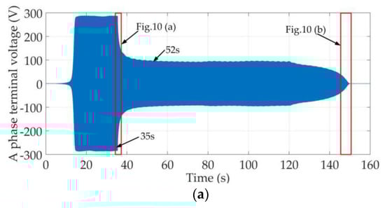 According to the existing load inductor, the load impedance was set to 261.7 Ω (L = 500 mH, R = 209 Ω). From the calculation method proposed in Part 4, the excitation capacitance corresponding to the critical load 261.7 Ω was 34.9 μF. Due to losses during the experiment consuming energy, the actual excitation capacitance should be slightly greater than 34.9 μF. In this experiment, the initial value of excitation capacitance was set to 35.5 μF. Figure 9 shows the voltage and current waveforms of phase A respectively.