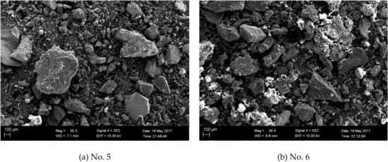 Scanning electron microscope (SEM) photographs of the clean coal samples (Nos. 5–10 in Table 3) are presented in Figure 8. In sample 5, the coal particles and the reagent were not uniformly bound. The particle size of the coal particles was generally large, the fine mud was entrained, and the slime cover was severe. In sample 6, the coal particles and the chemical reagent were uniformly and tightly combined. Also, the coal particle size was small, the distribution was relatively uniform, the fine mud entrainment was small, and the cover was less. In sample 7, the distribution of the reagent on the surface of the coal particles was extremely uneven, and the reagents were concentrated on the surface of a small part of the coal samples. The symbiotic phenomenon of fine mud and coal particles was very serious, and the distribution of coal particles was not uniform. In sample 8, the fine mud entrainment was less, and the symbiosis between fine mud and coal particles was lighter. Sample 9 had a larger particle size and the reagent was evenly distributed on the surface of the coal particles. There was basically no fine mud cover or entrainment. In sample 10, the particle size of the coal was smaller, the reagent was distributed evenly, and some fine mud entrainment occurred.