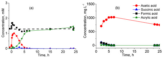 ) and NO2− (▲); and (b) concentrations of carboxylic (di)acids.