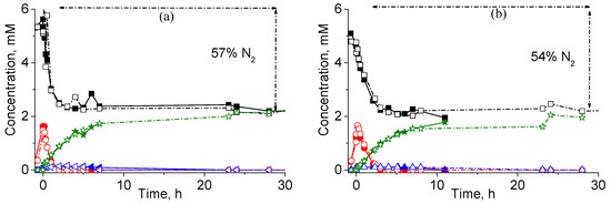 | Time (h) | Pt Leached (%) | TN (mM) | NH4+ (mM) | NO2− (mM) | NO3− (mM) | Inorganic N (mM) |