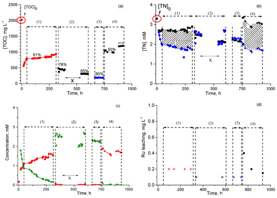 , nitrate) and (d) the leaching of Ru during these different periods with contact times (tcs) of (1) 0.99 h gcata gTOC−1, (2) 1.98 h gcata gTOC−1, (3) 2.97 h gcata gTOC−1, and (4) the initial conditions of period (1). X: reaction was stopped because of a leak in the liquid pump.