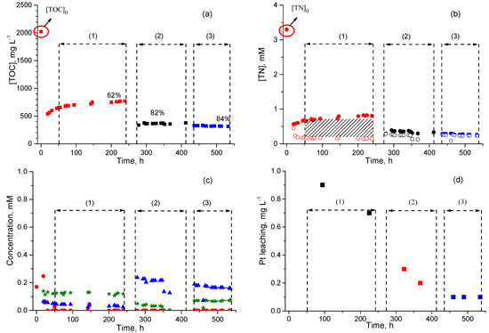 , nitrate; ▲, nitrite), and (d) leaching of Pt during these different periods; contact time (tc) of (1) 0.99 h gcata gTOC−1, (2) 1.98 h gcata gTOC−1, (3) 2.97 h gcata gTOC−1.