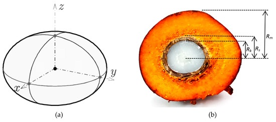 Geometry of oil palm fruit (a) Spheroid shape, (b) Section to measure mean radius for fruit, endocarp, and kernel.