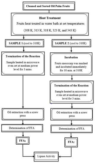 Wound-induced assay technique was used to initiate the residual activity of the endogenous lipase after the heat treatment. As illustrated in Figure 2, fruit in Sample 2 was cooled down to 310 K, in which wounding of the sample was initiated by mashing the mesocarp of the fruit as quickly as possible (i.e., to minimize the temperature drop) in a mortal. This action creates the required inter-phase (oil–water) for the lipase activity. The mashed mesocarp was immediately incubated in an incubator at 310 K for 10 min. After that, Sample 2 was removed from the incubator and straight away heated in a microwave oven to stop the activity of the residual enzyme completely. CPO was thereafter extracted from Sample 1 and Sample 2 using a laboratory scale screw press.