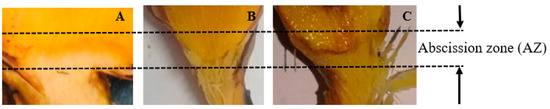 The OPF has two types of AZ—one large multilayer primary AZ (Figure 4A) and up to four adjacent AZ that are less distinguishable [37]. The primary AZ lies between the pedicel and mesocarp tissues at the base of the fruit, while the adjacent AZ are at the periphery of the primary AZ. The primary AZ of ripe oil palm fruit has high levels of un-methyl esterified pectin that cements or binds the mesocarp cells with the pedicel. As shown in Figure 4A, the mesocarp was rigidly glued to the pedicel in a freshly harvested OPF spikelet. However, pectin is soluble in water [38] and when the fruit were heat-treated in water at 343 K, the pectin dissolved and completely disappeared (Figure 4B). The dissolution of the pectin left a cleavage between the mesocarp and pedicel, signaling the detachment of the fruit. Similar disappearance of the pectin layer was also observed in Figure 4C which is a sample treated in boiling water (373 K) for the same duration of 60 min.
