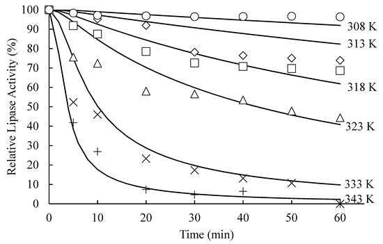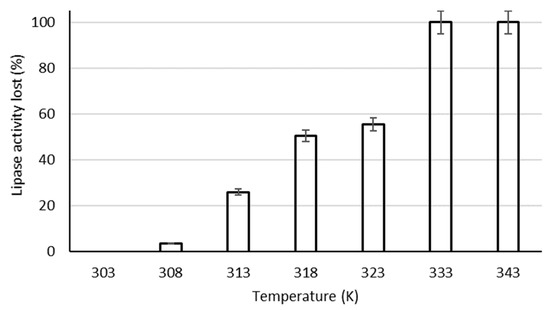 Endogenous lipase activity lost after the treatment at different temperatures (K) for 60 min.