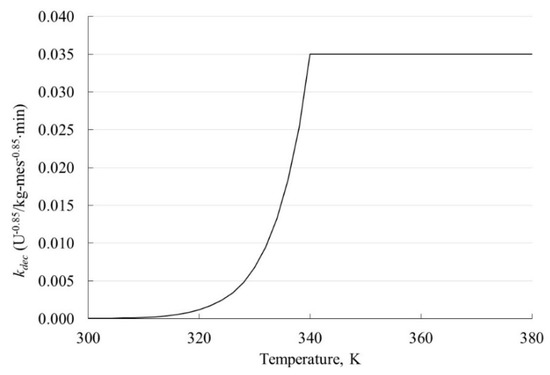 where the kinetic rate is temperature dependent based on the Arrhenius equation, as shown in Equation (10), which is its value will remain constant when reaching a temperature higher than 340 K.