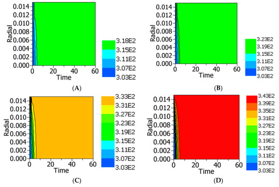 Contour plot of simulated heat distribution within OPF immersed in water at (A—318 K, B—323 K, C—333 K and D—347 K).