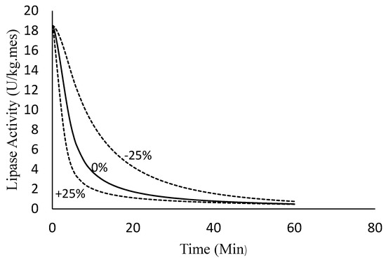 The sensitivity analysis was carried to evaluate the sensitivity of the models by changing some selected parameters. Two parameters were investigated, namely; the initial reaction rate constant (k0dec) and the reaction order (nd). The nominal value of k0dec (0.035) was adjusted ±25% and the effect of the changes on the predicted residual activity was plotted in Figure 11. It can be observed that a change as small as 25% in these parameters caused a visible change in the predicted residual activity. A one-way analysis of variance (ANOVA) between the predicted lipase activity when the simulation was run with the nominal value of k0dec and when adjusted ±25% shows that there is statistically significant difference (P < 0.05) between the 3 sets of data. Hence, the model can be said to be very sensitive to this parameter.