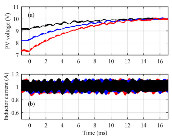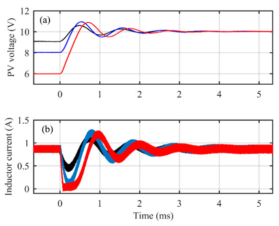 Figure 10 shows the behavior of the PVG voltage (a) and inductor current (b) when the step changes of 0.037 (black), 0.075 (blue), and 0.15 (red) are applied to the duty ratio of the interfacing converter in CCR. According to