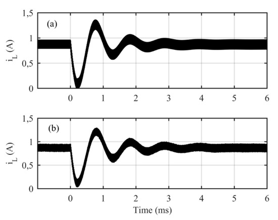 Figure 15 shows the comparison of the simulated (a) and experimental (b) inductor-current behavior when the predicted maximum step size (0.71 V) is applied.