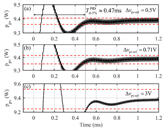 Figure 17 shows that the settling time matches with the prediction quite well (i.e., 0.46 ms vs. 0.47 ms, the inaccuracy equals +2.2%). It also shows that the settling time is invariant to the perturbation step size when the interfacing converter operates all the time in CCM. The invariance materializes due to the varying power settling band, which is computed by