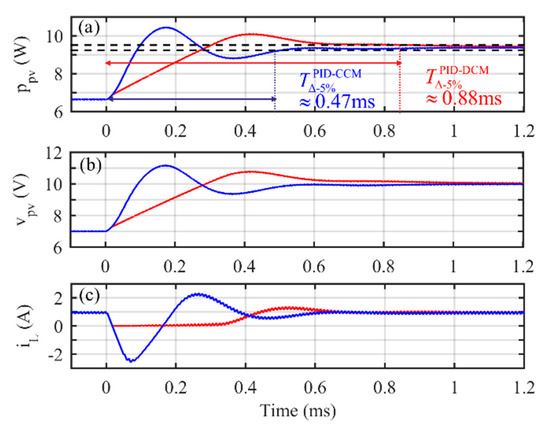 Figure 13, red curves). The red curves correspond to the DCM operation and the blue curves to the CCM operation, respectively. The PV-power settling band is computed as described above (cf.