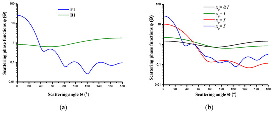 The variation of the considered scattering phase functions versus the scattering angle are demonstrated in Figure 1a,b. It is shown that the scattered radiation by fly ash particles for small particle size parameter presents a similar tends as B1 phase function. As xp increases, the scattered radiation tends to be directed towards the forward direction. F1 phase function seems to be adequate to represent the fly ash scattering behavior when xp = 5.
