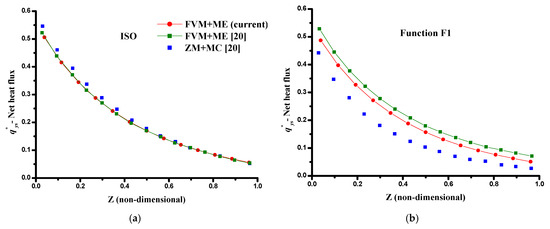 Figure 2a–c presents the net radiation heat flux density in y direction at the middle of bottom wall, along the z coordinate. The (FVM + ME) predictions corresponding to the isotropic case (Figure 2a) and carbon (Figure 2d), clearly follows the (ZM + MC) results. Figure 2b depicts that the F1 function predictions for function F1 of the heat flux with (FVM + ME) follow those obtained with the aid of (ZM+MC). The maximum discrepancy observed does not exceed 26%. For the scattering function B1, the achieved result is underestimated compared with benchmark.