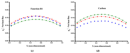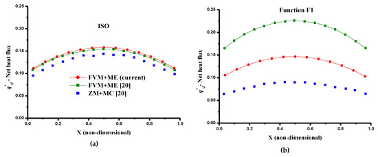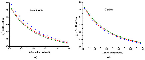 The z-component of the dimensionless net radiation heat flux density , at the middle of the cold front wall, along x-coordinate is shown in Figure 3a–c. First, the isotropic case, shown in Figure 3a presents an overestimation around 10.8% for the (FVM+ME) results as compared with the (ZM + MC) solutions. In Figure 3b, where the case of function F1 is shown, our results present an overestimation around 39% with benchmark (ZM + MC). Figure 3c shows the (FVM+ME) results corresponding to B1 phase function which agree well with the reference predictions. Figure 3d presents the (FVM+ME) predictions for carbon, and shows an overestimation ranging between 18.2% and 21.3%.