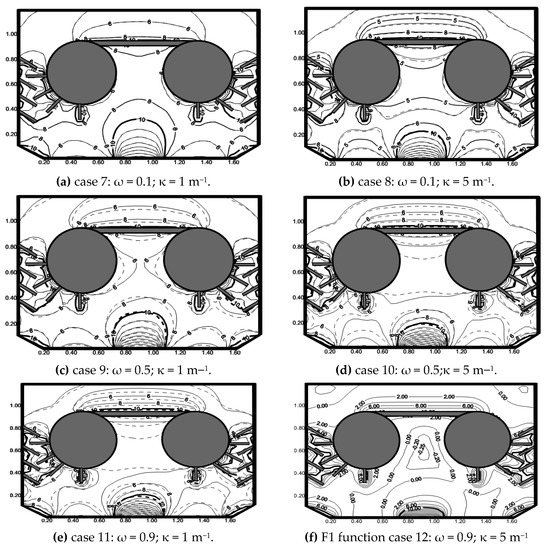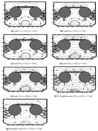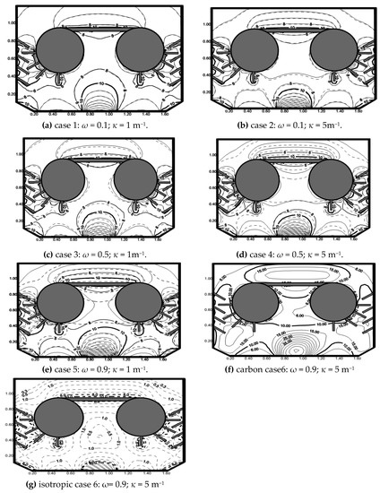 In this section, a comparison between isotropic and two anisotropic scattering functions (F1, carbon) is made. Figure 5a–g shows the temperature contours at plane z = 0.6 m, for six cases. It should be mentioned that the size parameter for carbon is xp = 1. First, for an absorption coefficient m−1 (states 1,3, and 5), when the albedo coefficient is relatively weak (i.e., ), it is observed that the temperatures distributions have the same pattern for the two-phase functions: Isotropic case as well as carbon. The impact of scattering anisotropy is negligible, as it refers to an optically thin body with little scattering. Furthermore, it is seen that higher temperatures are distributed near the inlet of the hot-gases region, and at the vicinity of the baffles while the temperature distribution tends to be uniform in the recuperator core region. When the albedo increases, it is seen that the temperature near the lateral baffles remains nearly constant (i.e., 700 K). In the rest of the recuperator, the difference between the temperature contours of the two phase functions is clear. This difference is pronounced with a larger albedo coefficient. For carbon, it can be noted that the isothermal line 700 K (in bold) tends towards the central region. Also, the temperature increases near the horizontal baffle and the cold wall. However, for the isotropic case, contours behavior is completely the opposite. This may be due to the fact that radiation is equally scattered while carbon scattering phase function seems to be a backward-directed function. For an absorption coefficient m−1 (cases 2, 4 and 6), on the one hand, it can be seen a remarkable deformation of the isothermal lines close to the inlet of the hot gases, towards the right pyrolysis room for carbon case especially when . In addition, there is an increase of the temperature namely in the centre of the recuperator and at the horizontal baffle. On the other hand, for the isotropic case, there is a decline of the temperature in the physical system mainly for a large value of the albedo coefficient, and it is shown a stagnation zone with the highest albedo coefficient, where the temperature about 410 K. In fact, in these regions, the thermal inertia is important, and radiation thermal energy tends to be stored. This phenomenon is perceived when the absorption and the albedo coefficients are high enough.