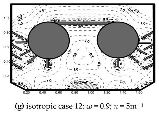 Figure 8a–g shows the net radiation heat flux density contours for F1 and isotropic function. It can be seen that the radiation energy has conducted to the hot area when the absorption and albedo coefficients increase, especially for the anisotropic case. Moreover, a stagnation zone with an unrealistic net radiation heat flux value of –0.25 kW·m−2 is seen, indeed, an artificial environment is studied. Furthermore, it should be pointed that the average temperature and net radiation heat flux gradually decrease as the albedo coefficient enhances for the isotropic state and function F1, while they increase for the carbon case due to the backward scattering behavior of carbon particles. Table 2 and Table 3 summarize the aforementioned results and also, include results for function B1.